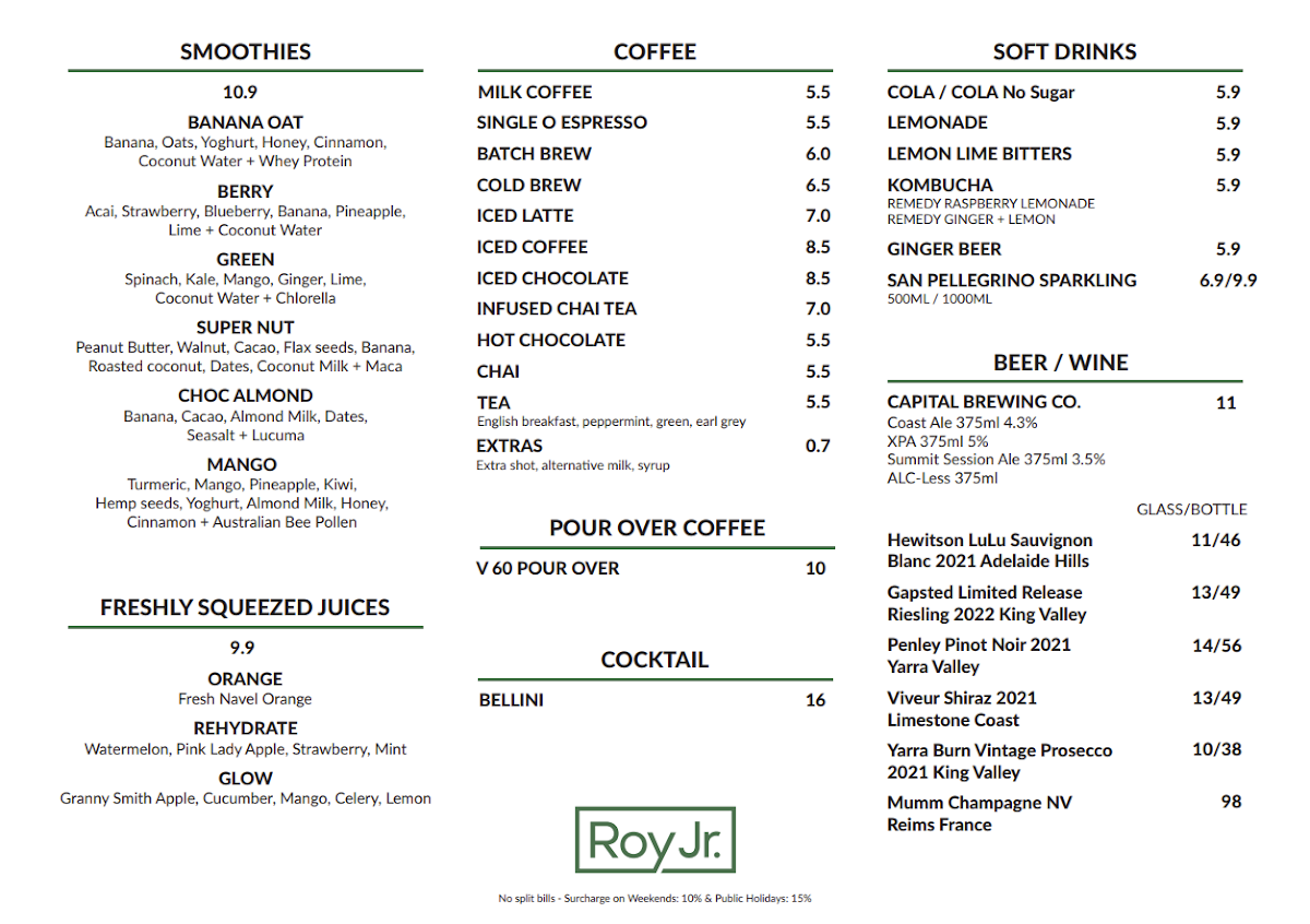 Welcome to Roy Jr., a charming café nestled in the heart of Canberra at 7 London Cct. Renowned for its commitment to quality and fresh ingredients, Roy Jr. offers an inviting atmosphere where every dish tells a story of flavor and thoughtfulness.